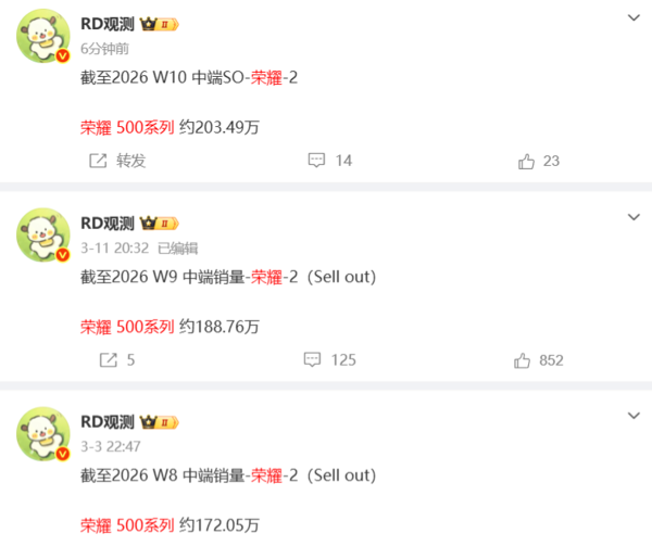 CNMO注意到,根据“RD观测”发布的系列数据,荣耀500系列截至2026年第8周累计销量约172.05万台;截至2026年第9周累计销量约188.76万台,单周新增约16.71万台;截至2026年第10周累计销量约203.49万台,单周新增约14.73万台。从第8周到第10周的三周时间内,荣耀500系列新增销量超过31万台,展现出稳定的市场热度。